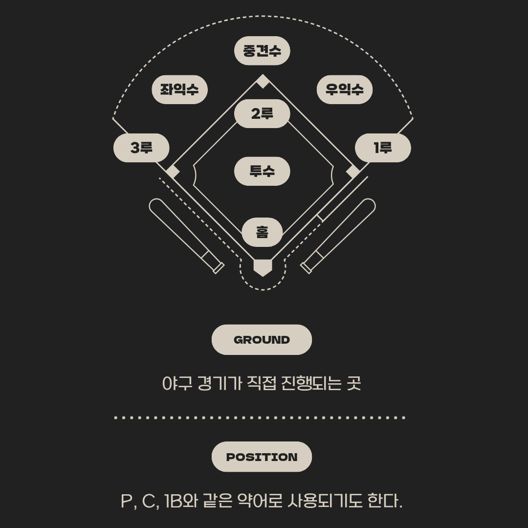 - 내야(Infield): 1루, 2루, 3루가 있는 부분으로, 주자가 주로 뛰는 곳이에요.